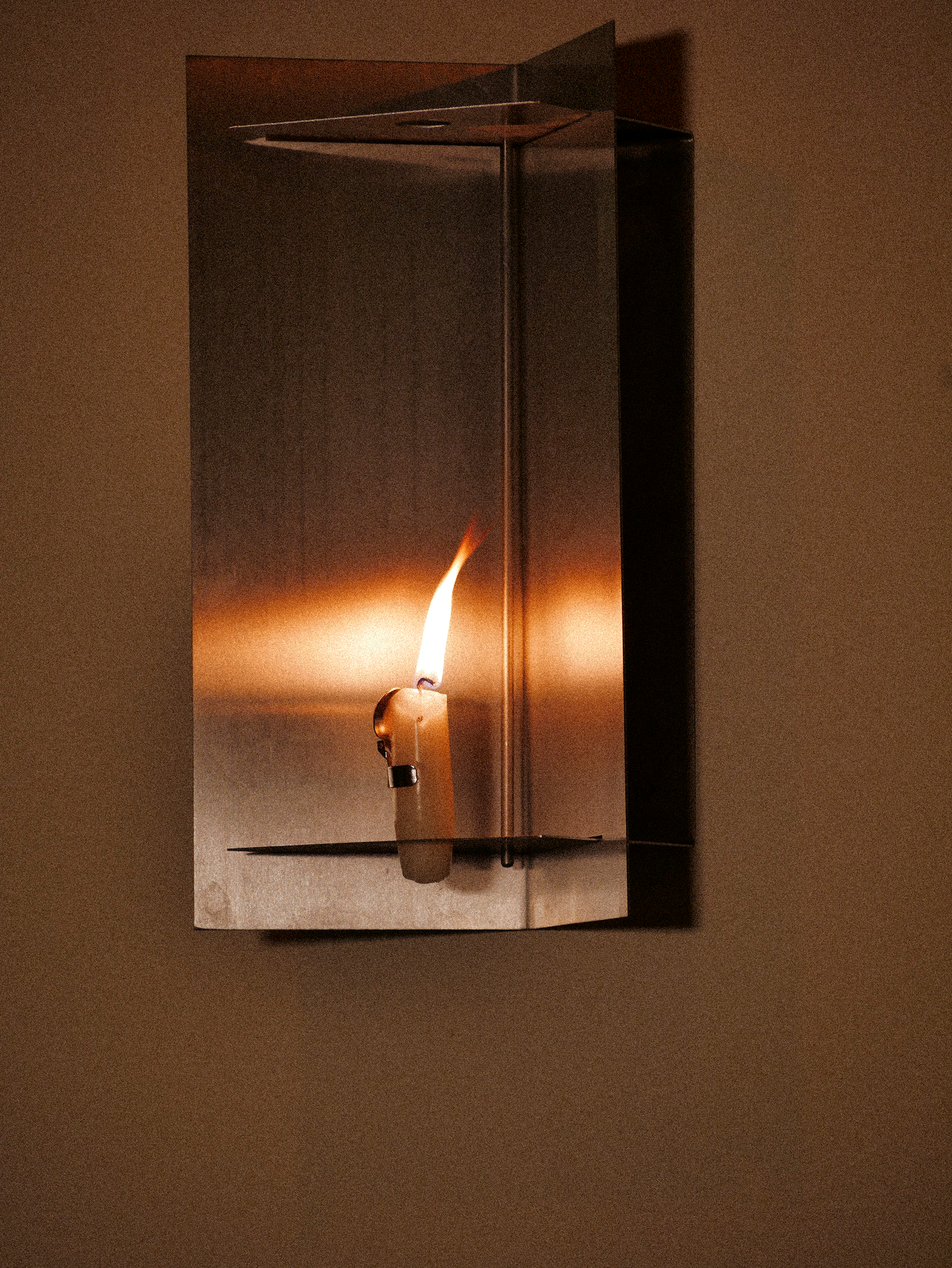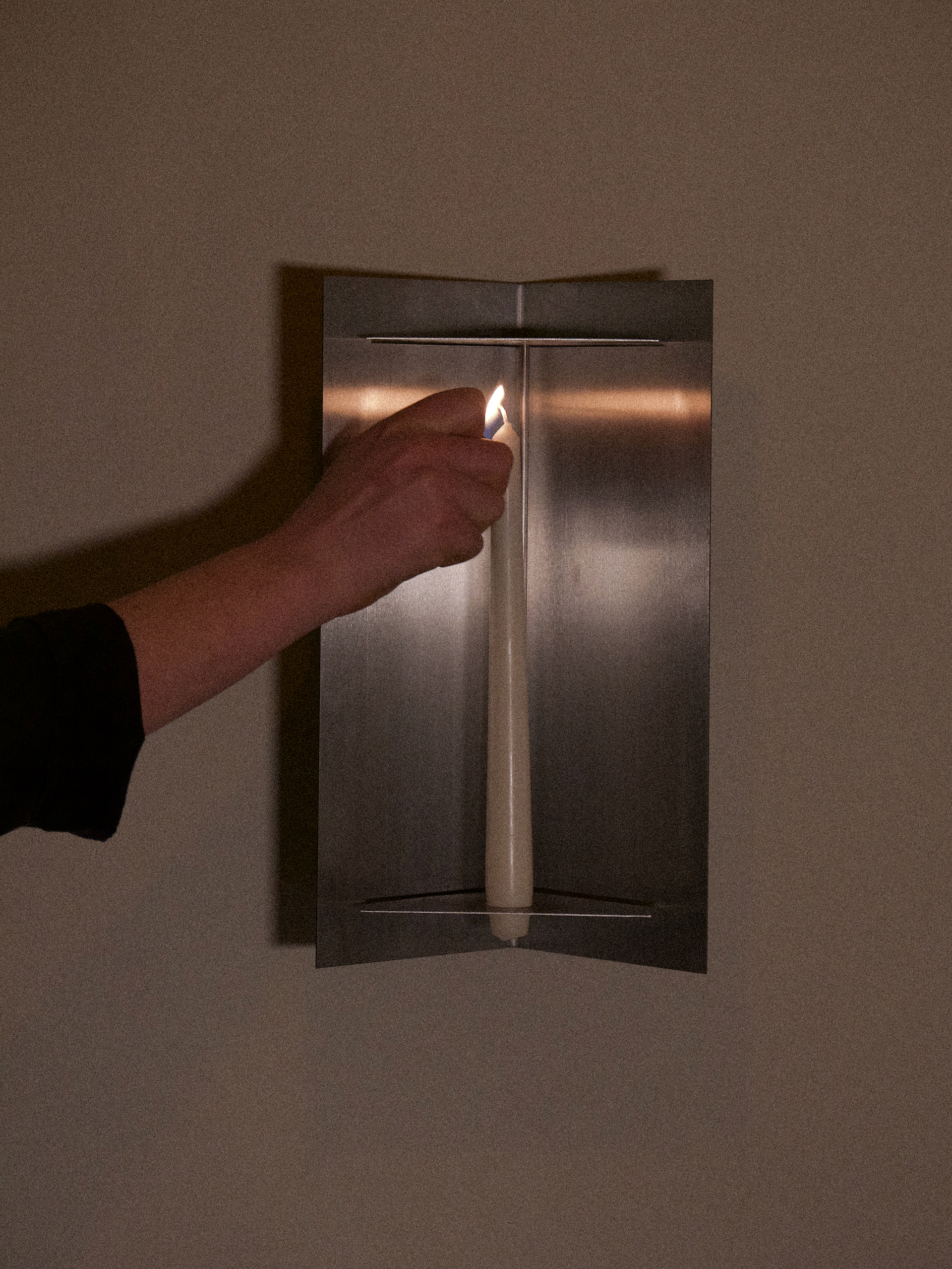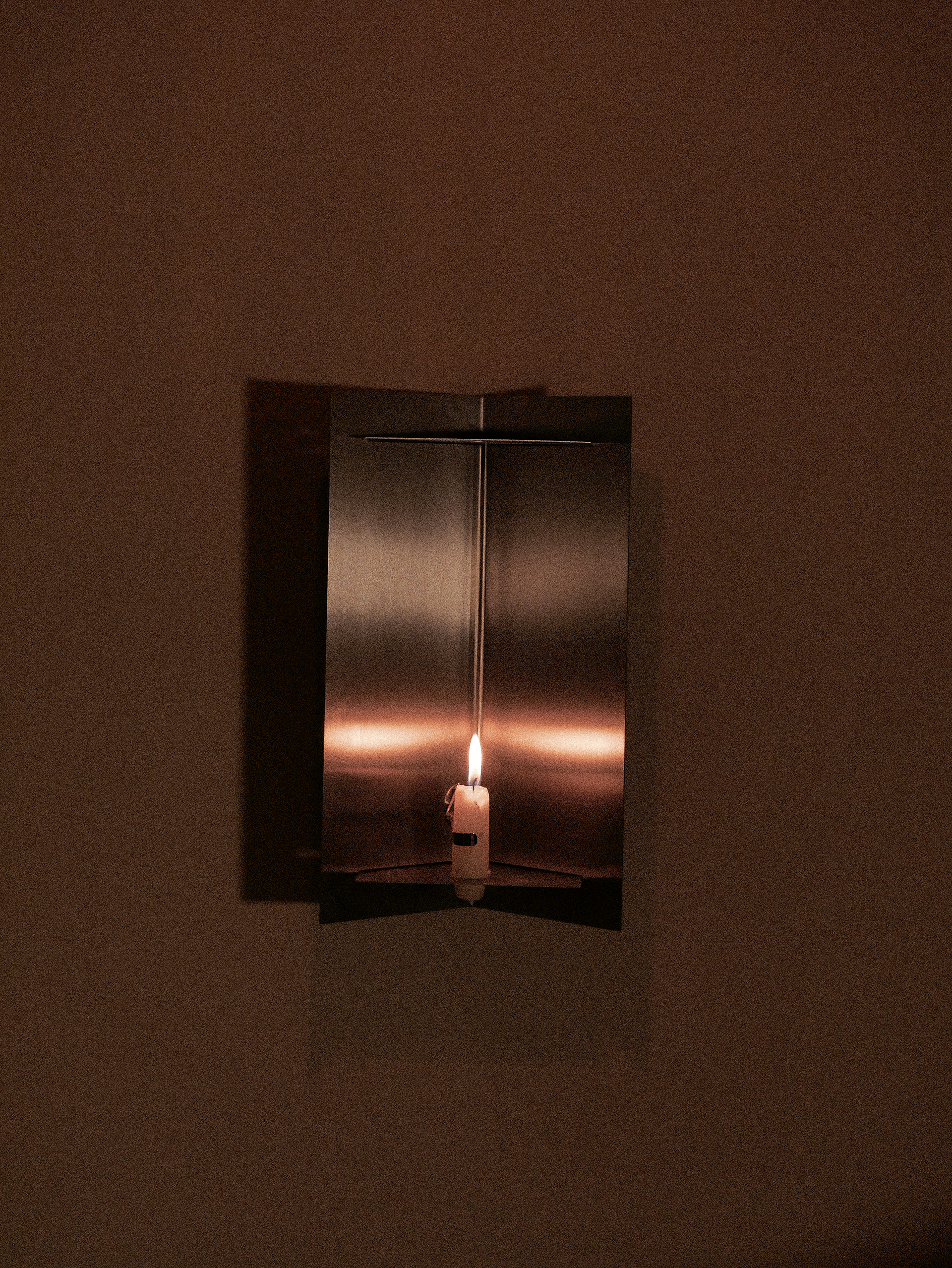 Its form draws subtle inspiration from a small wall shrine — a place of pause, intention, and quiet focus. Lighting a candle often marks a moment: a wish, a thought, a brief act of intention. Bougette translates that ritual into a contemporary object. The coolness of stainless steel contrasts with the warmth and movement of the flame — a refined reinterpretation of something deeply human. Minimal in form, deliberate in presence.